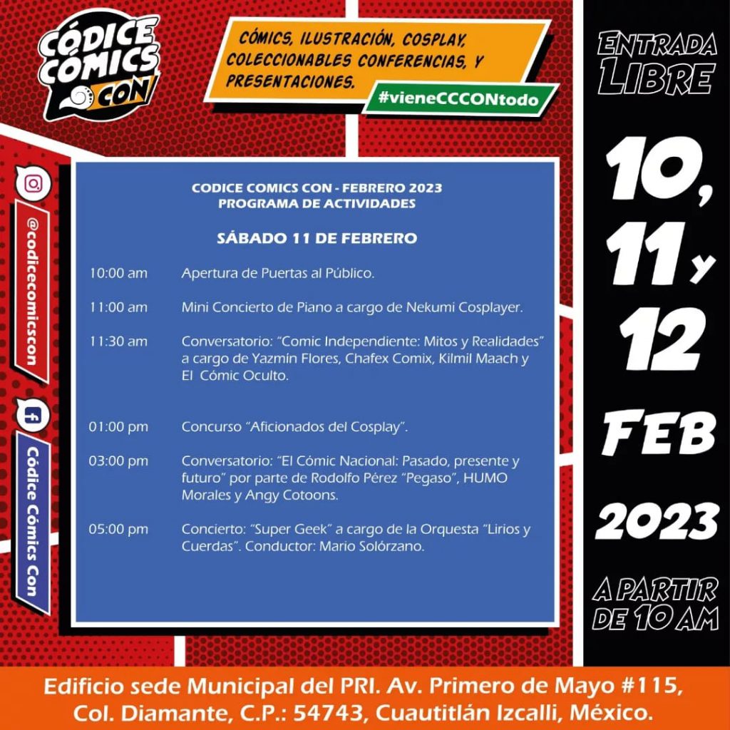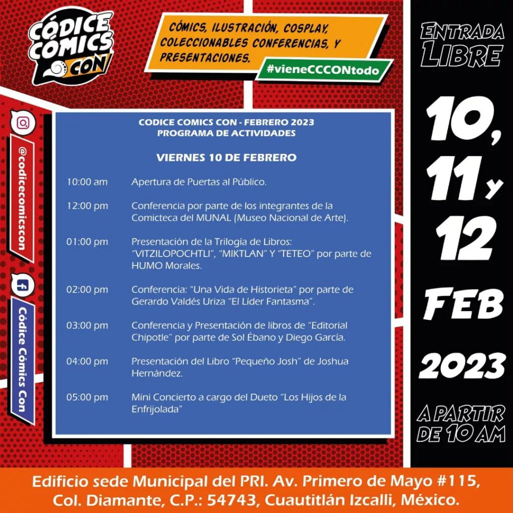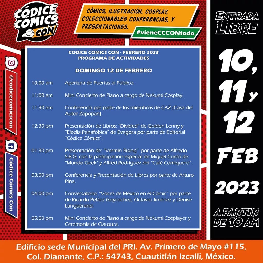 La Códice Cómics Con no sólo reunirá autores de cómic, ilustradores y cosplay, sino que también presentará un programa de conferencias, conversatorios y música durante los 3 días del evento. 10, 11 y 12 de Febrero 2023 en Cuautitlán Izcalli. NO FALTES!!
