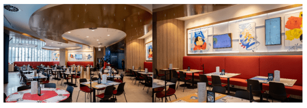 La cafetería contará con un proceso de pedido único donde los comensales pre-ordenarán sus alimentos en kioscos interactivos, y luego estos serán servidos directamente en su mesa. Los visitantes también serán sorprendidos con la proyección de videos que los harán revivir los momentos más memorables de las icónicas películas de Disney.
