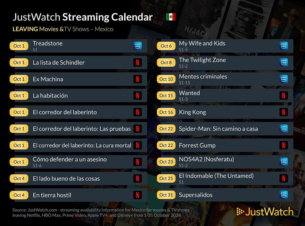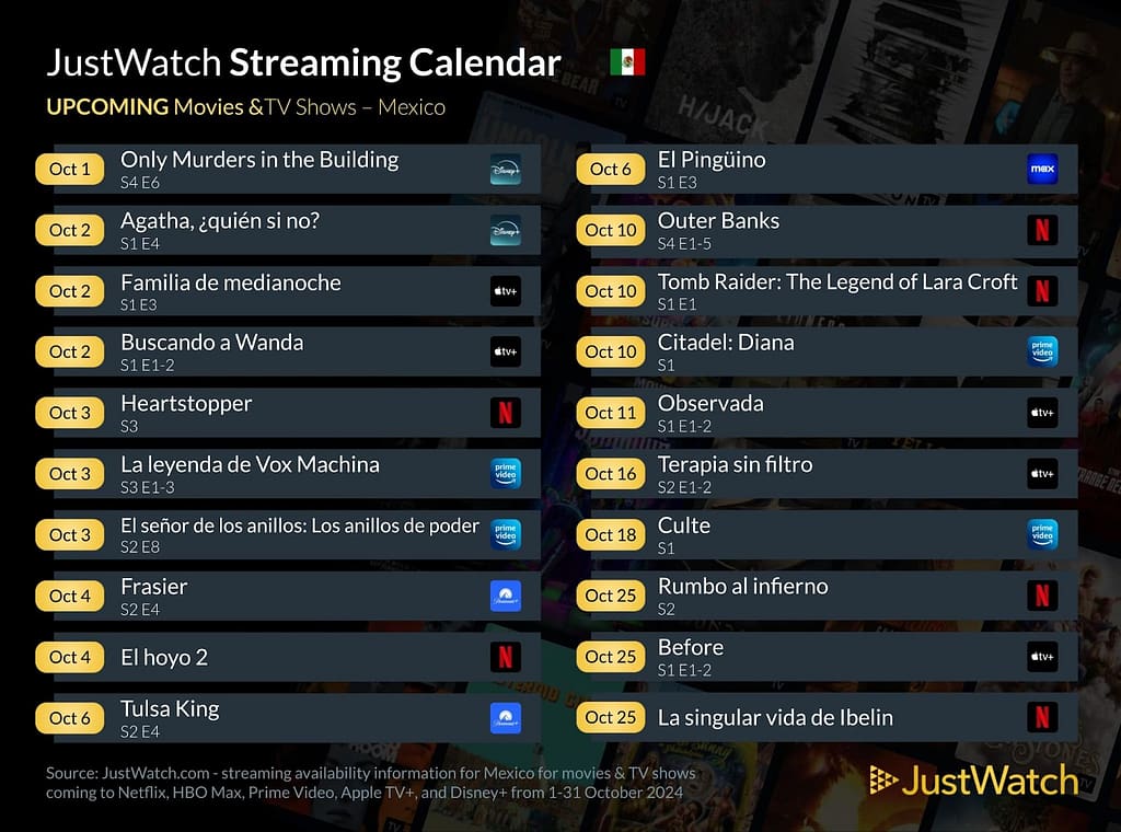 Como cada mes, el equipo de JustWatch nos trae la cartelera de estrenos que se podrán ver por los servicios de Streaming durante este mes de Octubre 2024 y también la lista de aquellas producciones que saldrán de los servicios de forma permanente.