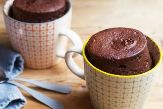 Un auténtico pastel de chocolate que no se siente como si estuviera hecho de mezcla para panqueques y levadura en polvo. Al congelar las claras de huevo, puedes convertirlas en espuma a mano en tres minutos. Además, incluso una pequeña cantidad de clara de huevo espumosa es suficiente, ya que la esponjosidad no desaparece antes de que el horno de microondas termine de calentar el pastel”.